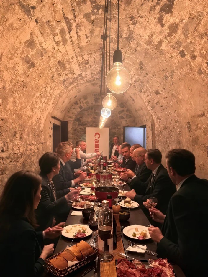 La formule de la soirée a été pensée pour favoriser les échanges : un afterwork détendu, suivi d’une fondue partagée autour de grandes tables. L’afterwork a permis aux invités d’échanger autour d’un verre, de renouer des contacts ou d’en créer de nouveaux, dans une ambiance informelle. Puis la fondue a redonné au rassemblement son côté familial et complice : partage, rires et conversations animées ont fait de ce repas un moment fort et mémorable. Cette combinaison afterwork-fondue reflète parfaitement l’objectif de l’événement : remercier nos clients pour leur fidélité en leur offrant une expérience à la fois conviviale et authentique.